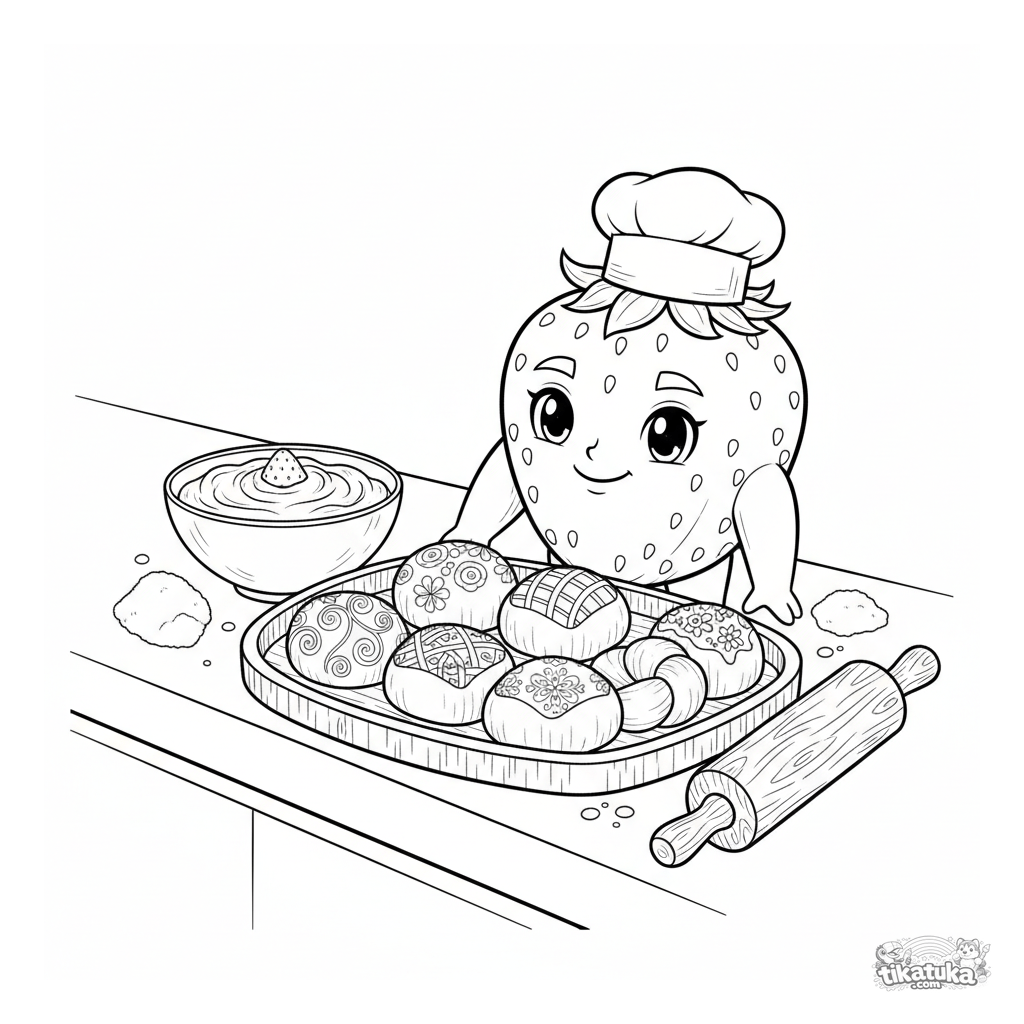 Детальная раскраска: клубничный моти в колпаке шеф-повара подаёт поднос с моти. Сцена на кухне для детей 10-12 лет. Сложная реалистичная иллюстрация для раскрашивания.