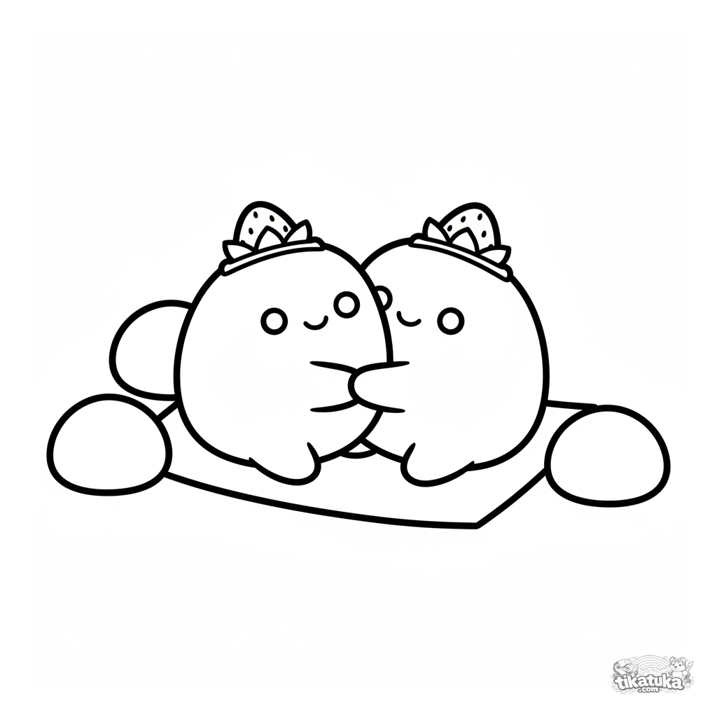 Раскраска для малышей: два милых клубничных моти обнимаются на листе рисовой бумаги среди других моти. Простые формы и широкие поля идеальны для первых карандашей.