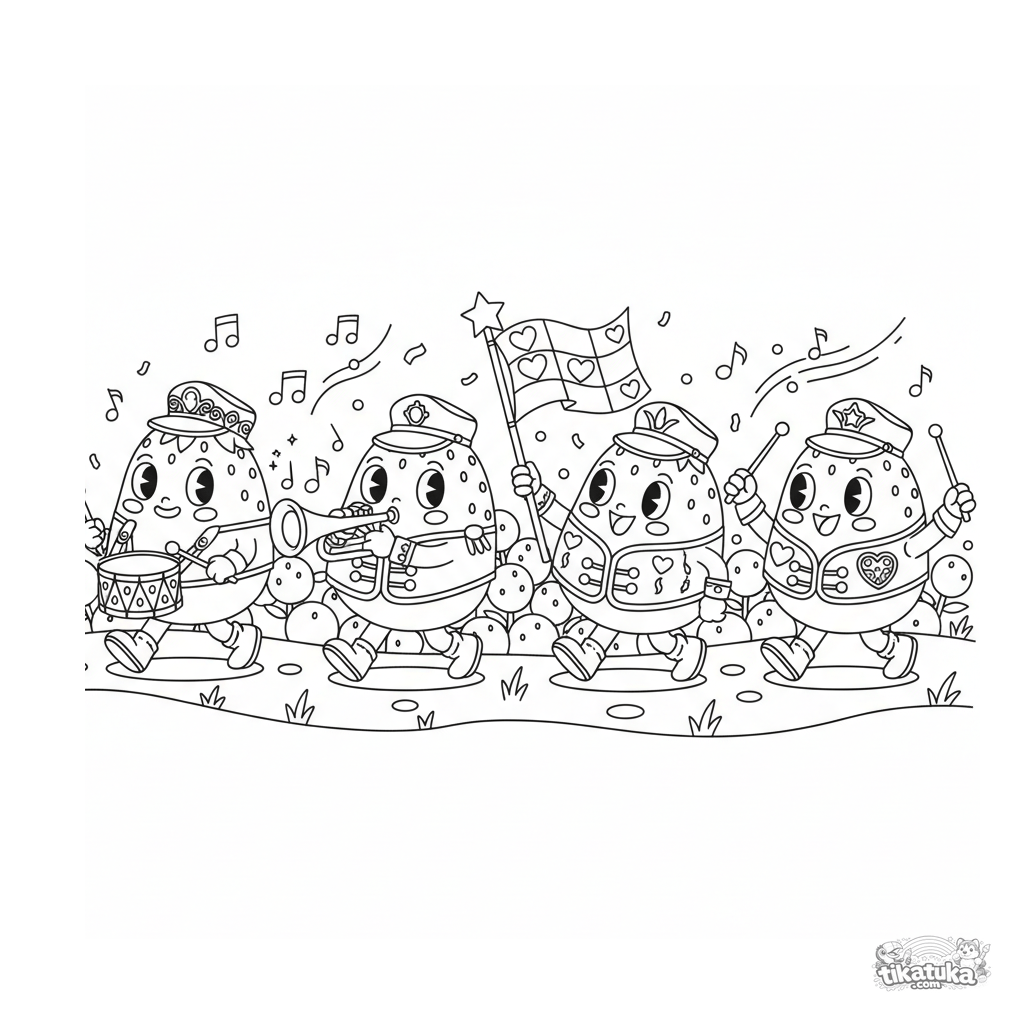 Динамичная раскраска с парадом клубничных моти-музыкантов. Подробная сцена для детей 10-12 лет с множеством элементов для раскрашивания.