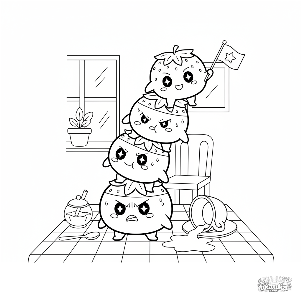 Раскраска с башней из клубничных моти, балансирующих на столе. Весёлая и шаткая сцена в стиле 90-х для детей 4-6 лет. Раскрась неустойчивое десертное сооружение!