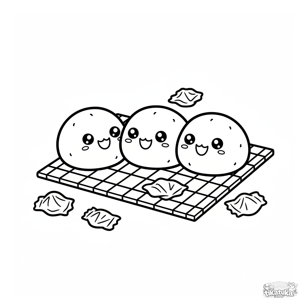 Раскраска для малышей: три милых клубничных моти на бамбуковой циновке. Простые формы и широкие поля идеально подходят для первых карандашей.