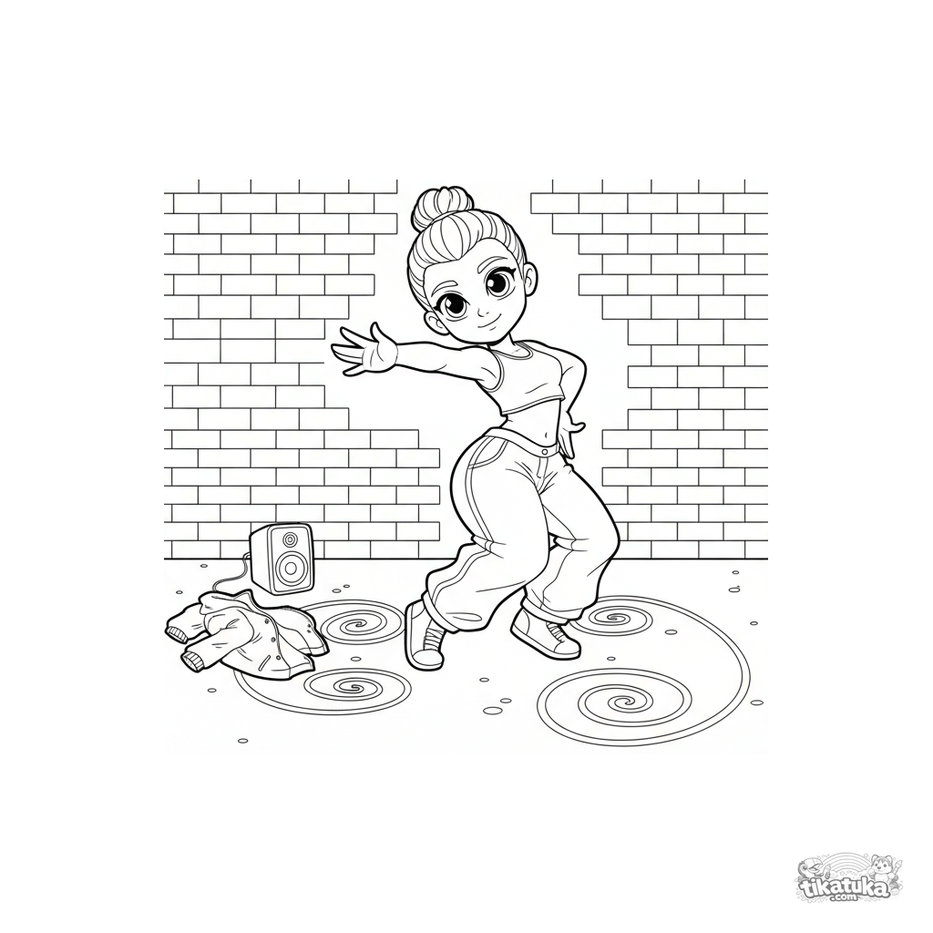 Раскраска для детей 7-12 лет: уличный танцор замирает в динамичной позе в городском переулке. Сцена с деталями одежды, колонкой и кирпичными стенами.