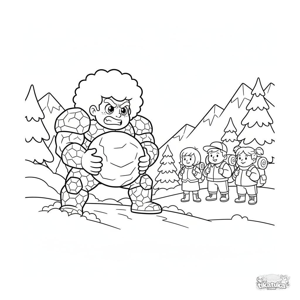 Раскраска для детей 7-9 лет: супергерой силы в каменной броне расчищает тропу, поднимая огромный валун в заснеженных горах.