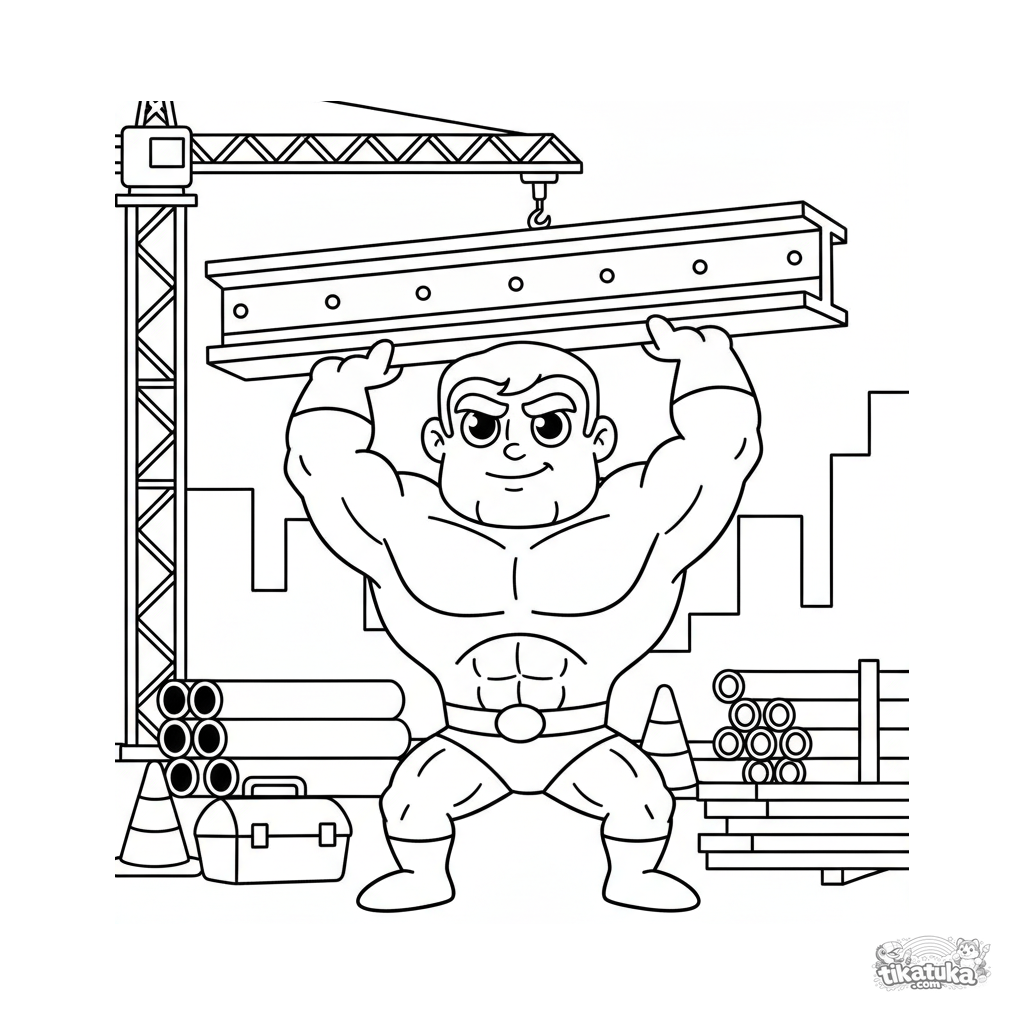 Раскраска для детей 4-6 лет: могучий супергерой помогает на стройке, поднимая тяжелую стальную балку на место.