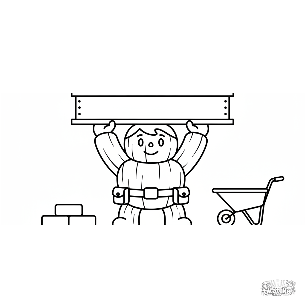 Раскраска для малышей 2-3 года: большой и сильный супергерой поднимает металлическую балку на строительной площадке с кирпичами и тачкой.