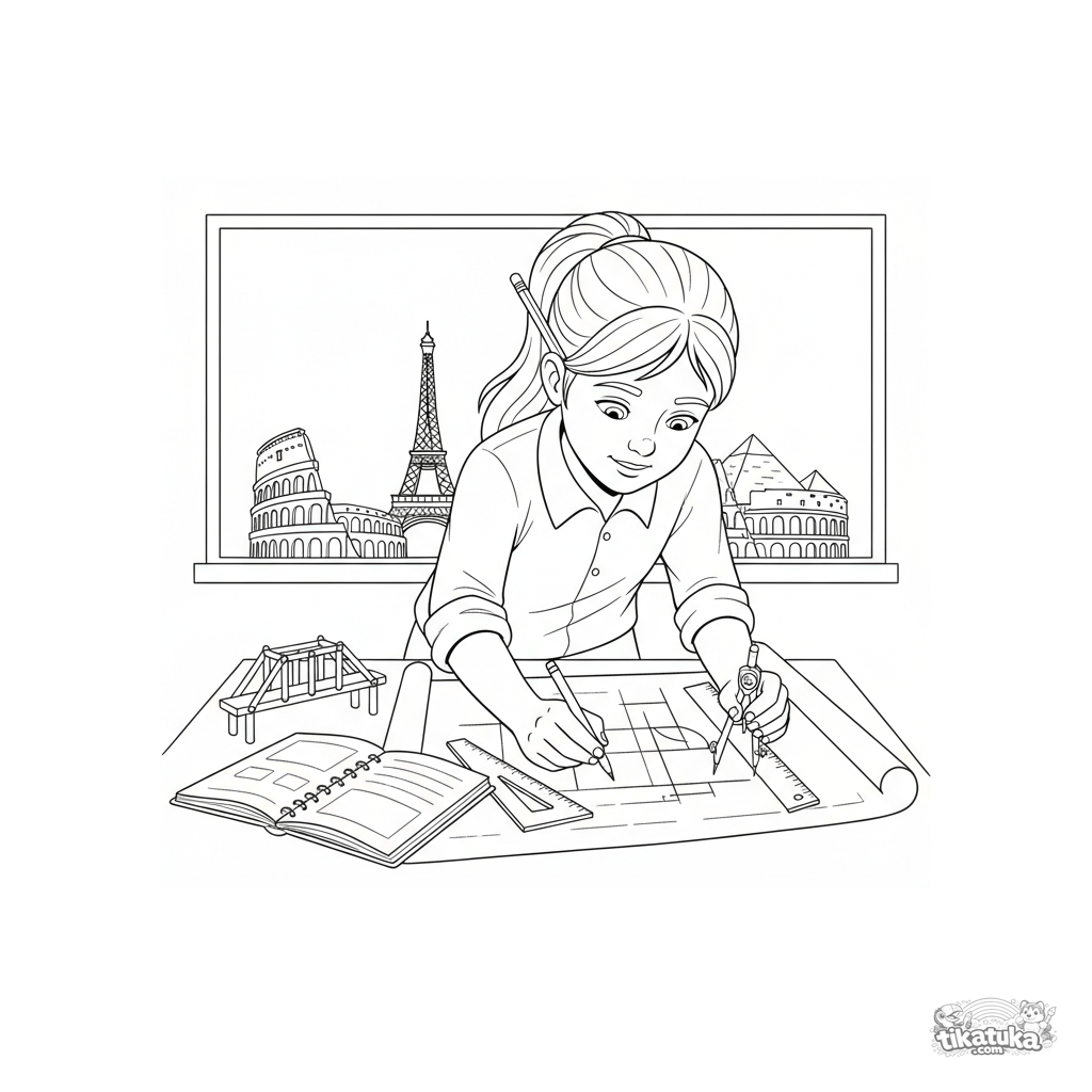 Раскраска для детей 7-9 лет: увлечённый юный архитектор за школьной партой чертит детальный план, используя линейку и циркуль, на фоне доски с эскизами зданий.