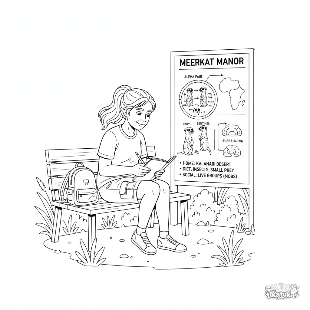 Детальная раскраска для детей 10-12 лет. Студент с блокнотом зарисовывает информационный щит с диаграммой семьи сурикатов на скамейке в зоопарке.