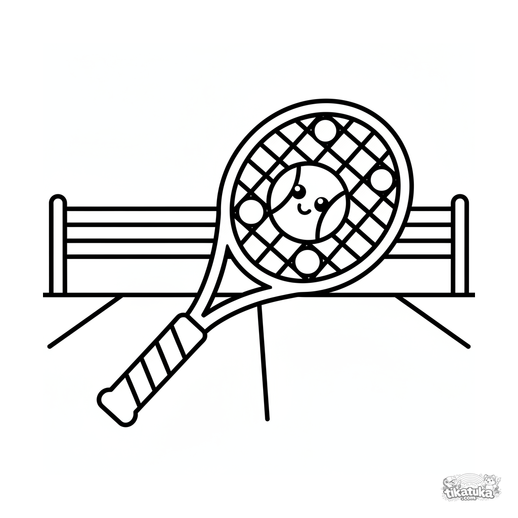 Очень простая раскраска для малышей 2-3 лет: большая стилизованная ракетка и улыбающийся мяч лежат на линиях теннисного корта. Четкие толстые контуры.