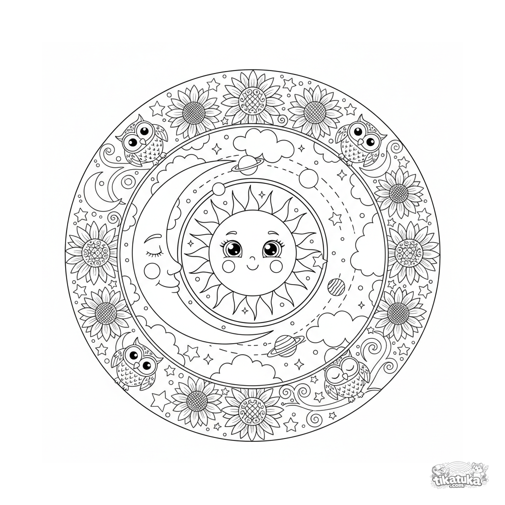 Детальная небесная мандала-раскраска Солнце и Луна для детей 10-12 лет. Улыбающееся солнце, полумесяц, орбиты планет, совы и подсолнухи.