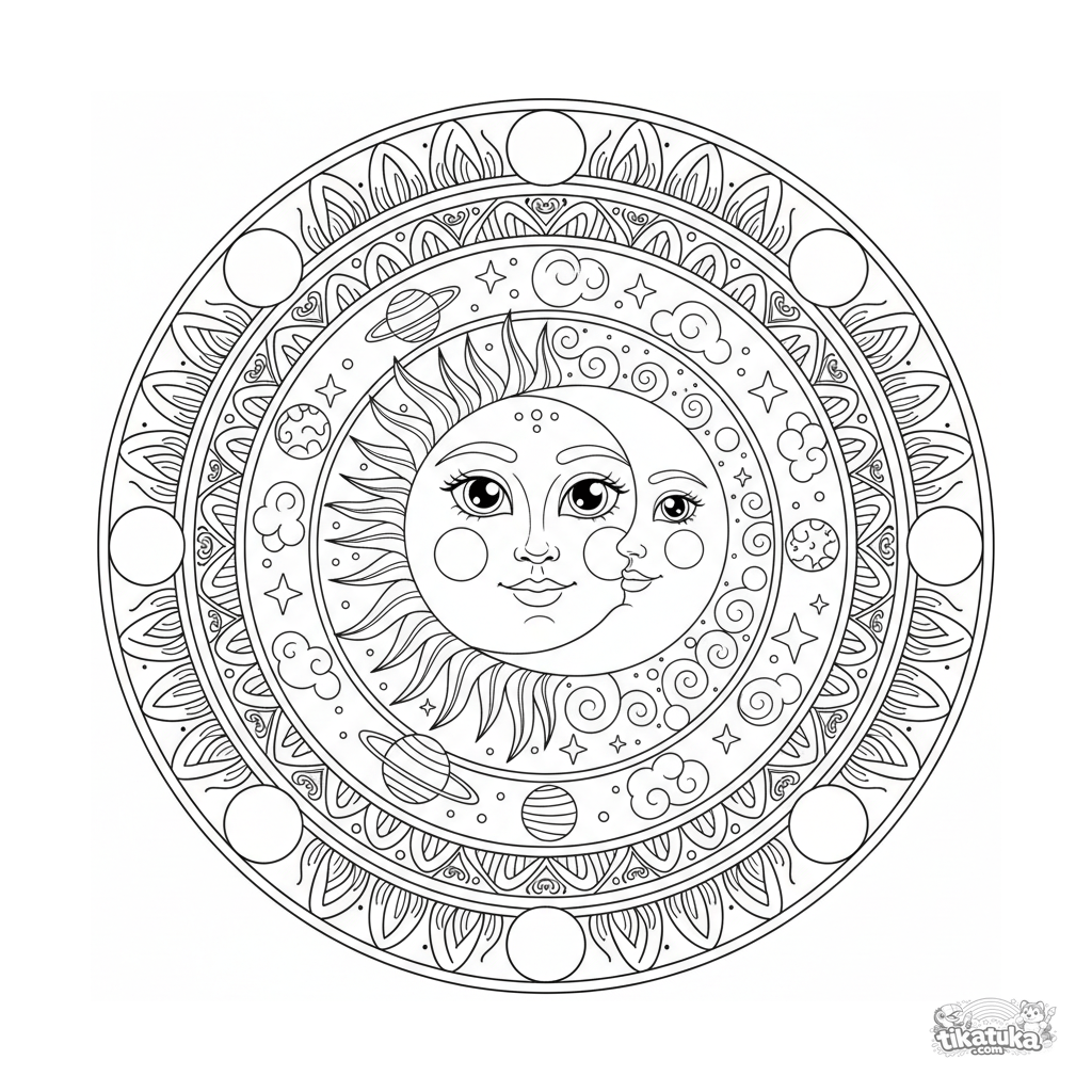 Небесная мандала-раскраска Солнце и Луна для детей 10-12 лет. Лица светил, орбитальные кольца планет, звезды и фазы луны по краю.