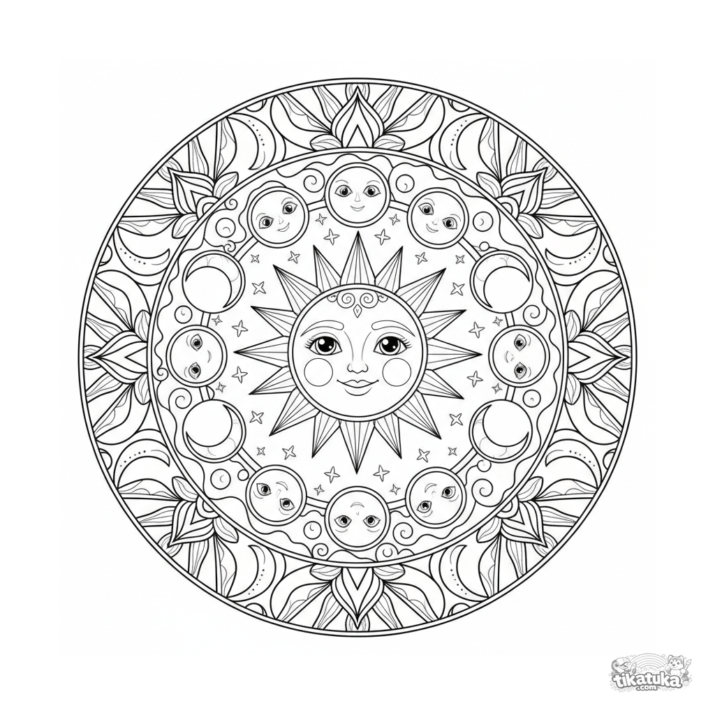 Детализированная небесная мандала-раскраска для детей 10-12 лет. В центре солнце с лучами, кольцо фаз луны, облака и звёзды. Богатая символика.