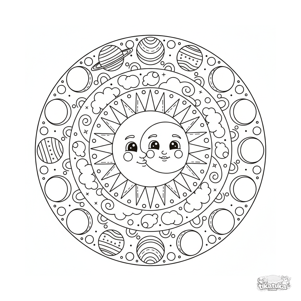 Детальная небесная мандала-раскраска для детей 10-12 лет. Центр — солнце и луна, кольца лучей, облаков, звёзд, планет и фаз луны на космическом фоне.