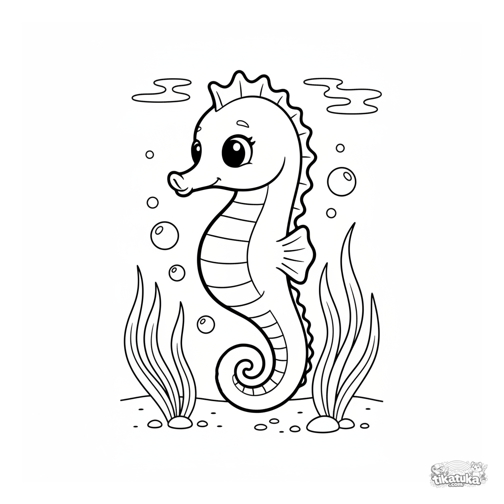 Раскраска с морским коньком, танцующим в лучах солнца среди морской травы на мелководье. Для детей 4-6 лет. Мирная подводная сцена.
