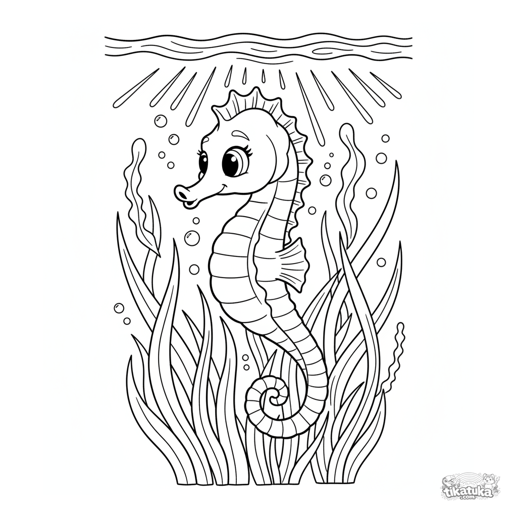 Раскраска с морским коньком, пасущимся в морской траве на мелководье, куда проникают солнечные лучи. Для детей 4-6 лет. Простые и чёткие контуры.