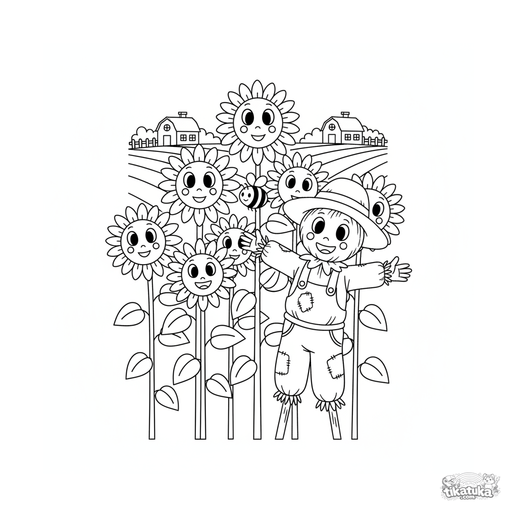 Раскраска для детей 4-6 лет: веселое поле подсолнухов с добрым пугалом и пчелкой. Яркая летняя сцена с читаемыми формами для дошкольников.