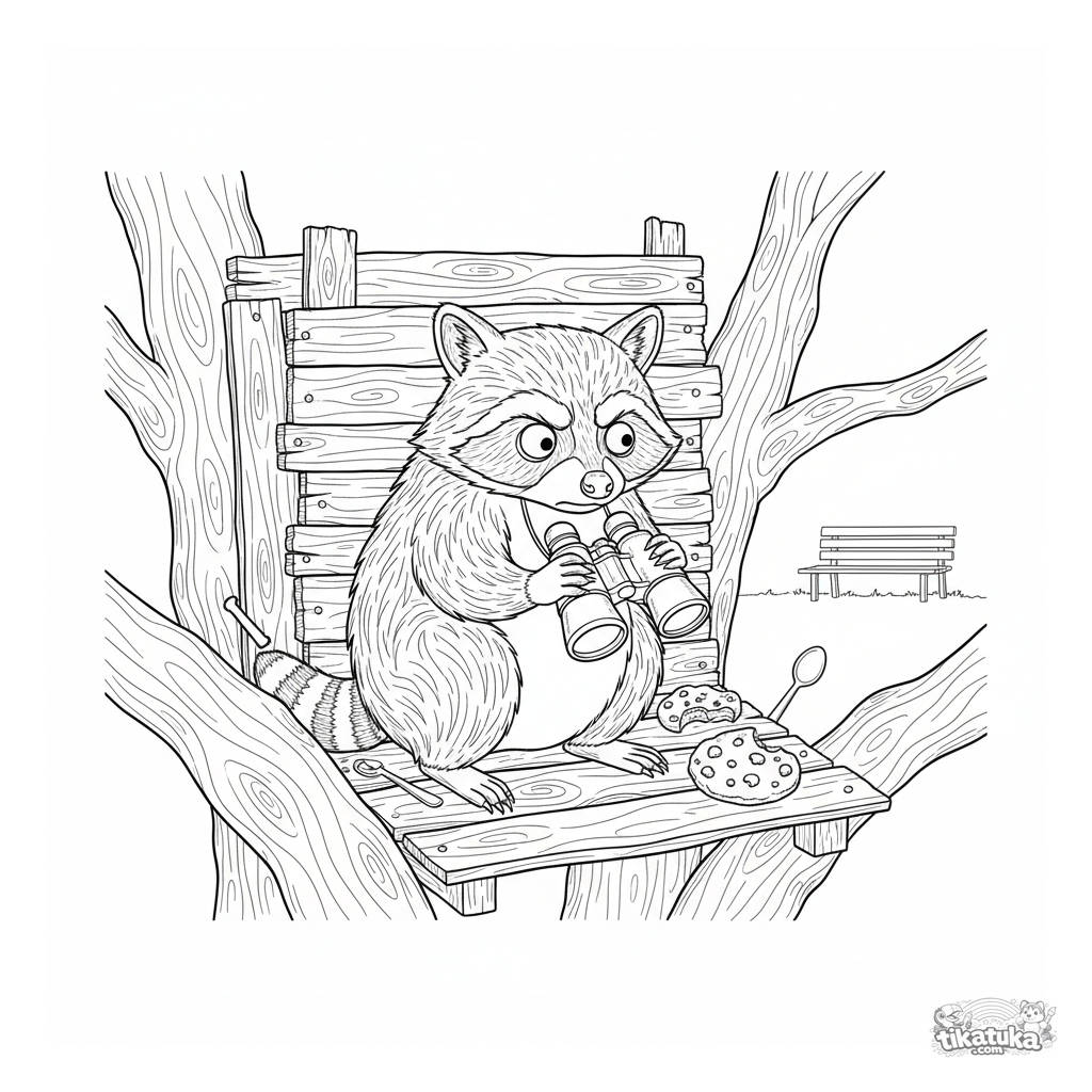 Раскраска для детей 10-12 лет: подозрительный енот в домике на дереве в парке шпионит в бинокль за скамейкой. Детализированный мем с юмором и фоном.