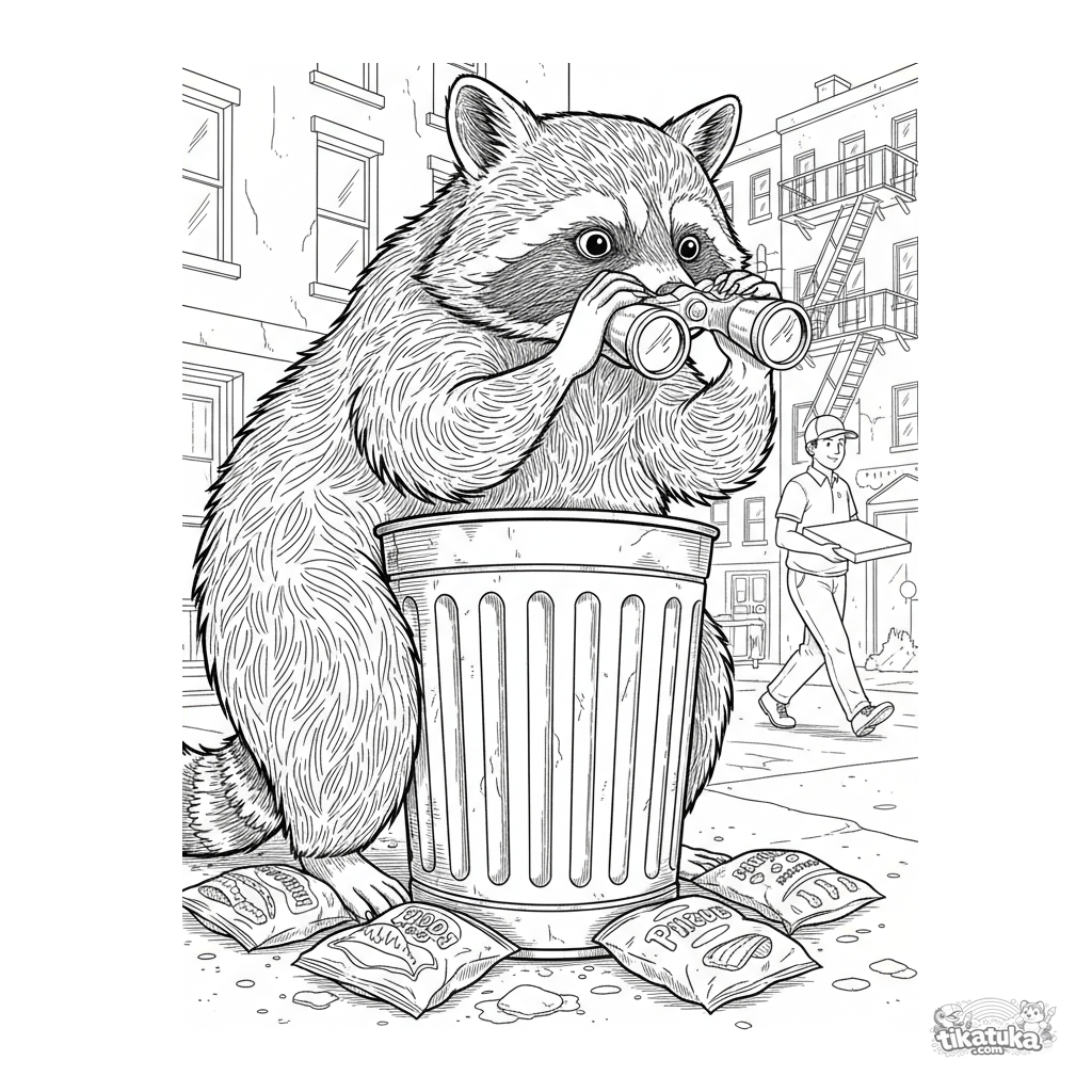 Раскраска для детей 10-12 лет: подозрительный енот в мусорном баке с биноклем выслеживает доставку пиццы в городской аллее. Детальный юмористический мем.