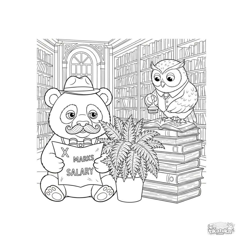 Детальная раскраска в стиле графического романа: подозрительная красная панда-шпион в библиотеке выслеживает зарплату. Смешной мем с картой, совой-библиотекарем и пальмой для укрытия.