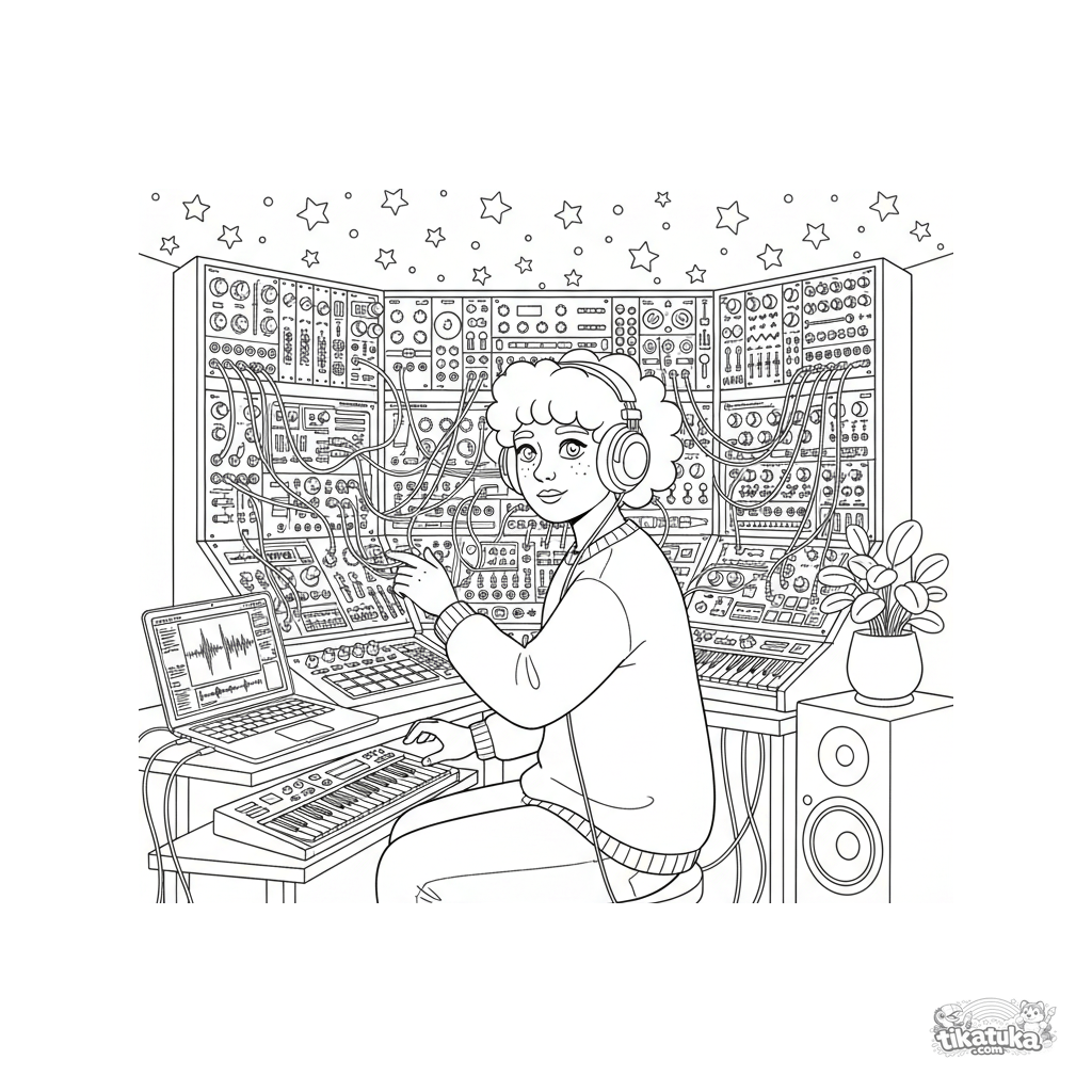 Раскраска для детей 10-12 лет: продюсер электронной музыки создает трек в подвальной студии. Детали: модульный синтезатор, патч-кабели, ноутбук, светящиеся звезды. Реалистичный стиль.