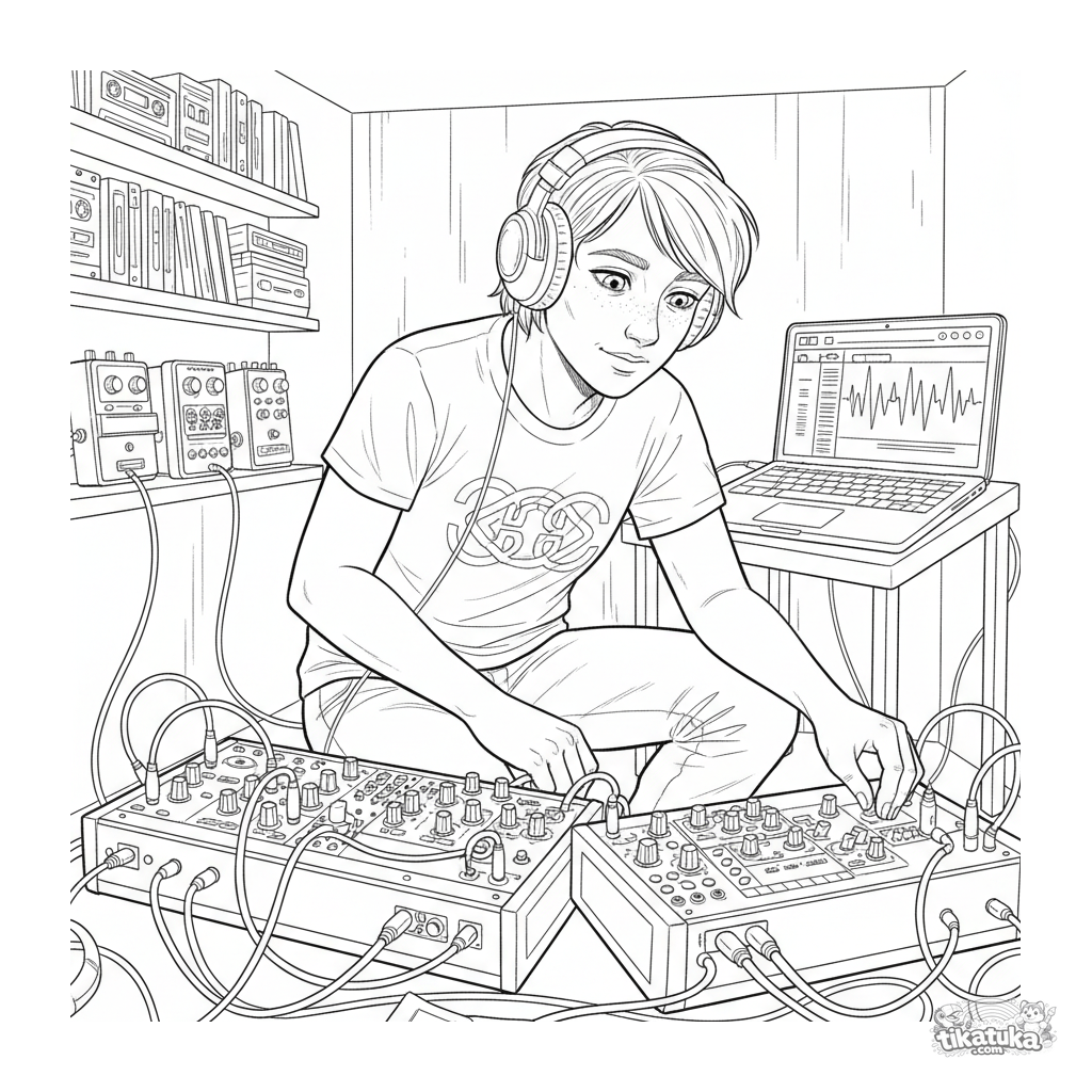 Раскраска для детей 10-12 лет: музыкант создает электронную музыку на синтезаторе в подвальной студии. Детализированная сцена в стиле городского скетча.