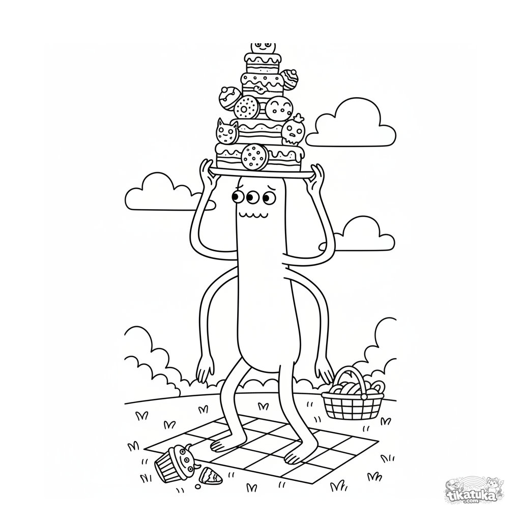 Раскраска для детей 7-9 лет: длинный монстр с тремя глазами балансирует башню из тортов на голове на пикнике. Забавная и динамичная сцена.