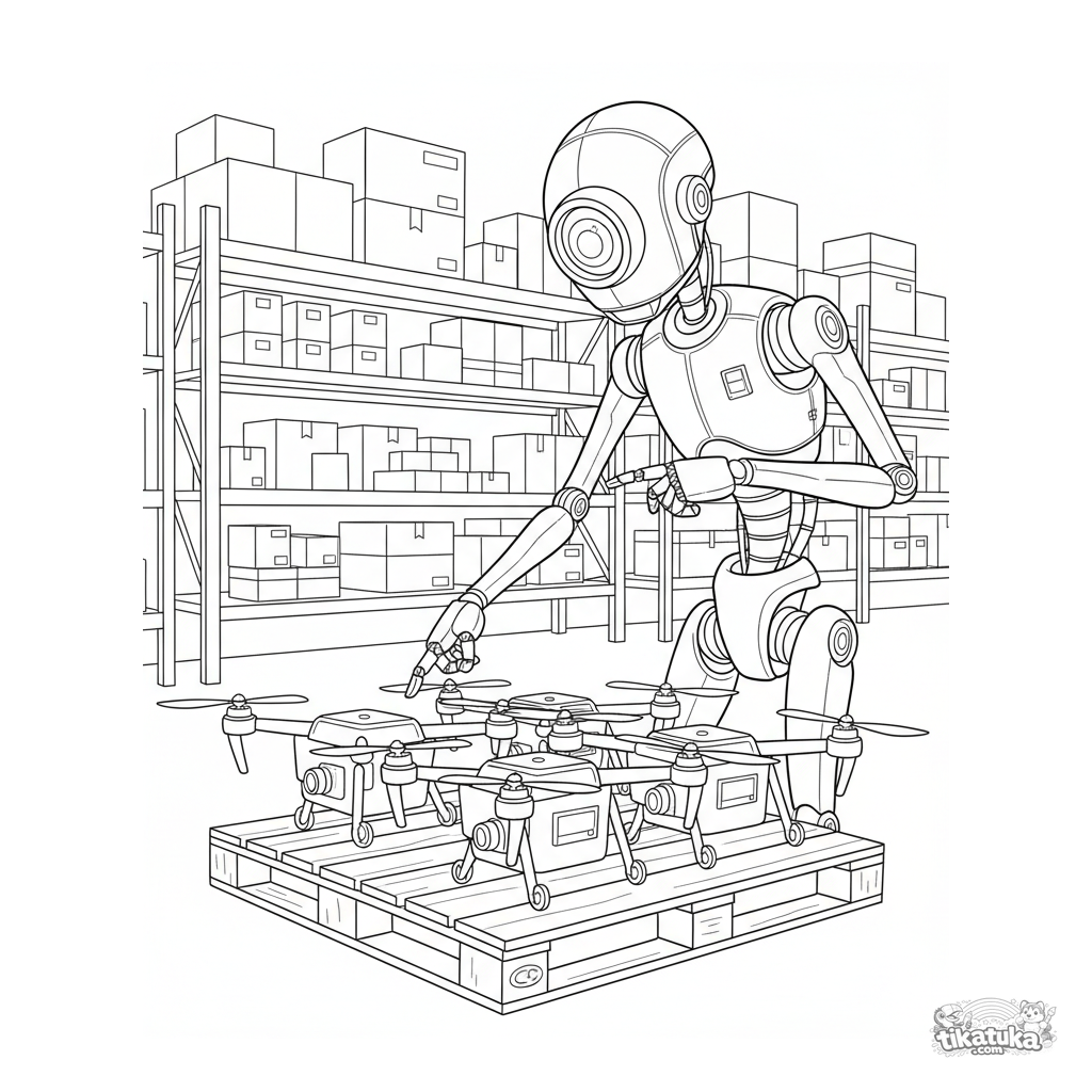 Раскраска для детей 10-12 лет: высокий робот-сканер с оптическим объективом проверяет паллету с дронами на большом автоматизированном складе.