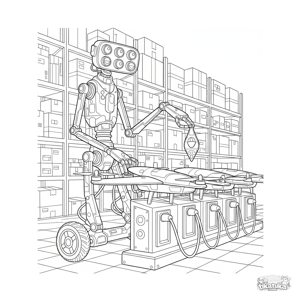 Раскраска для детей 10-12 лет: высокий робот-сканер проводит техосмотр дронов на складе. Детализированные контуры, реалистичный стиль, интересно для старшего возраста.