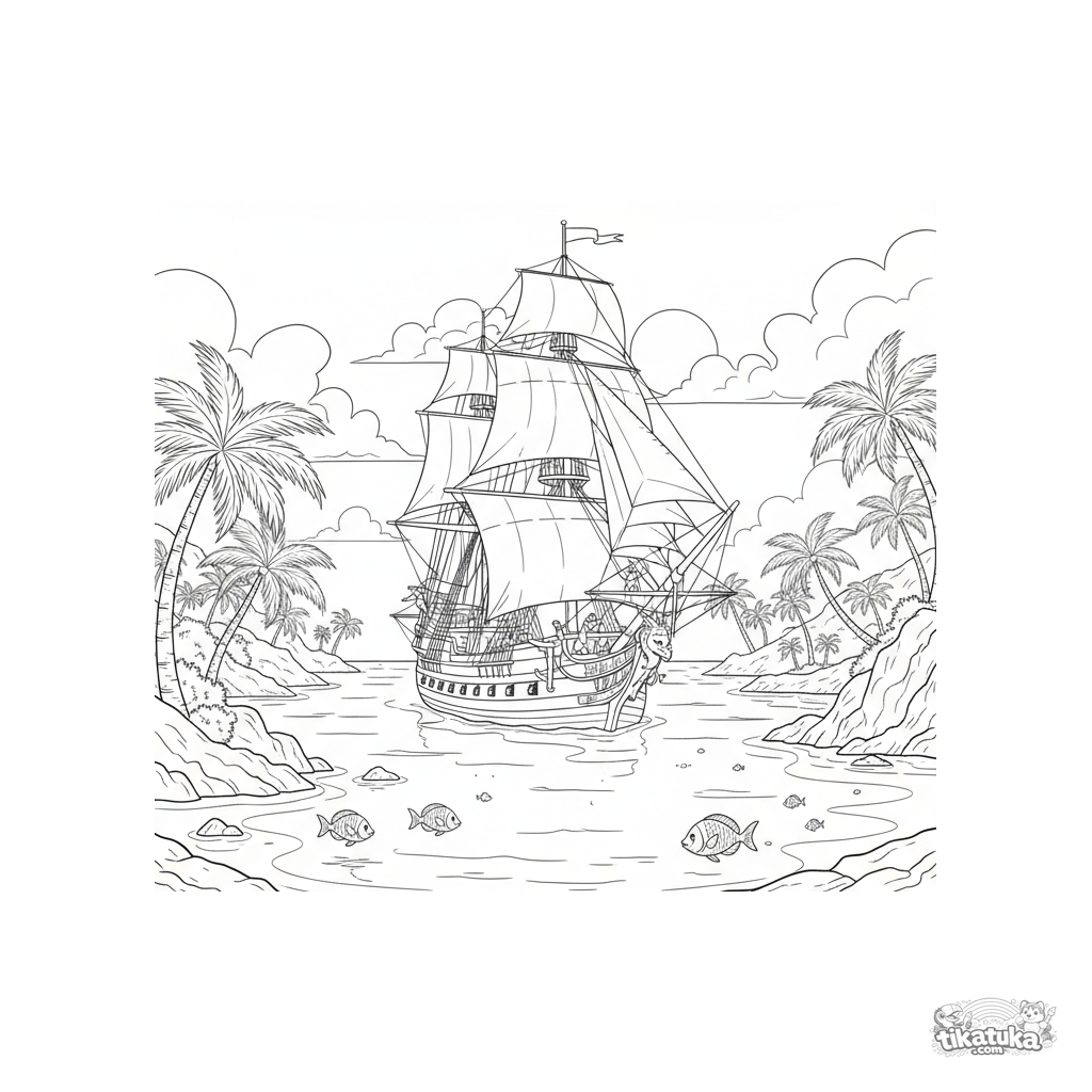 Раскраска для детей 10-12 лет: детализированный трёхмачтовый парусник заходит в прозрачную тропическую бухту с пальмами. Матросы на снастях, богатая сцена прибытия.