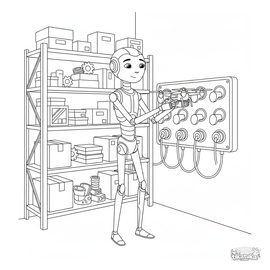 Раскраска для детей 7-9 лет: высокий робот обслуживает станцию зарядки для дронов на складе. Детализированные конечности, полки с запчастями. Умеренная детализация и выразительная поза.