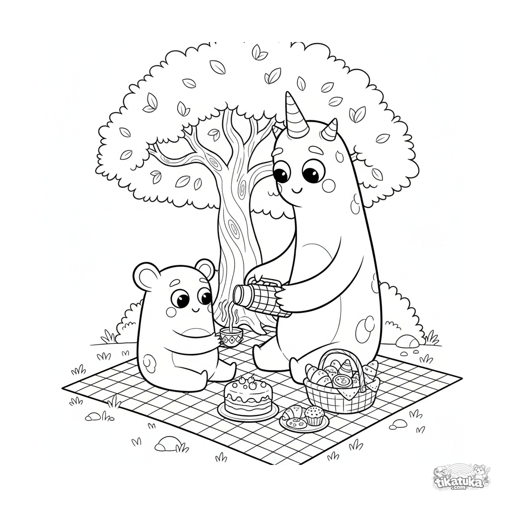 Раскраска для детей 7-9 лет: высокий дружелюбный монстр наливает ягодный чай на пикнике с монстро-сладостями. Сцена дружбы и угощения.