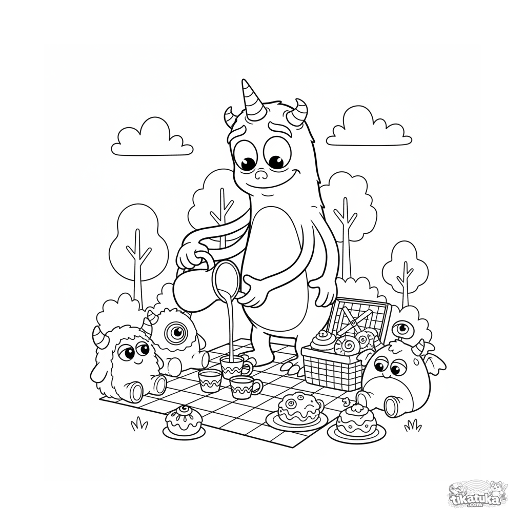 Раскраска с высоким монстром, наливающим сок на пикнике с друзьями. Для детей 7-9 лет. Весёлая сцена с монстро-сладостями и клетчатым одеялом.