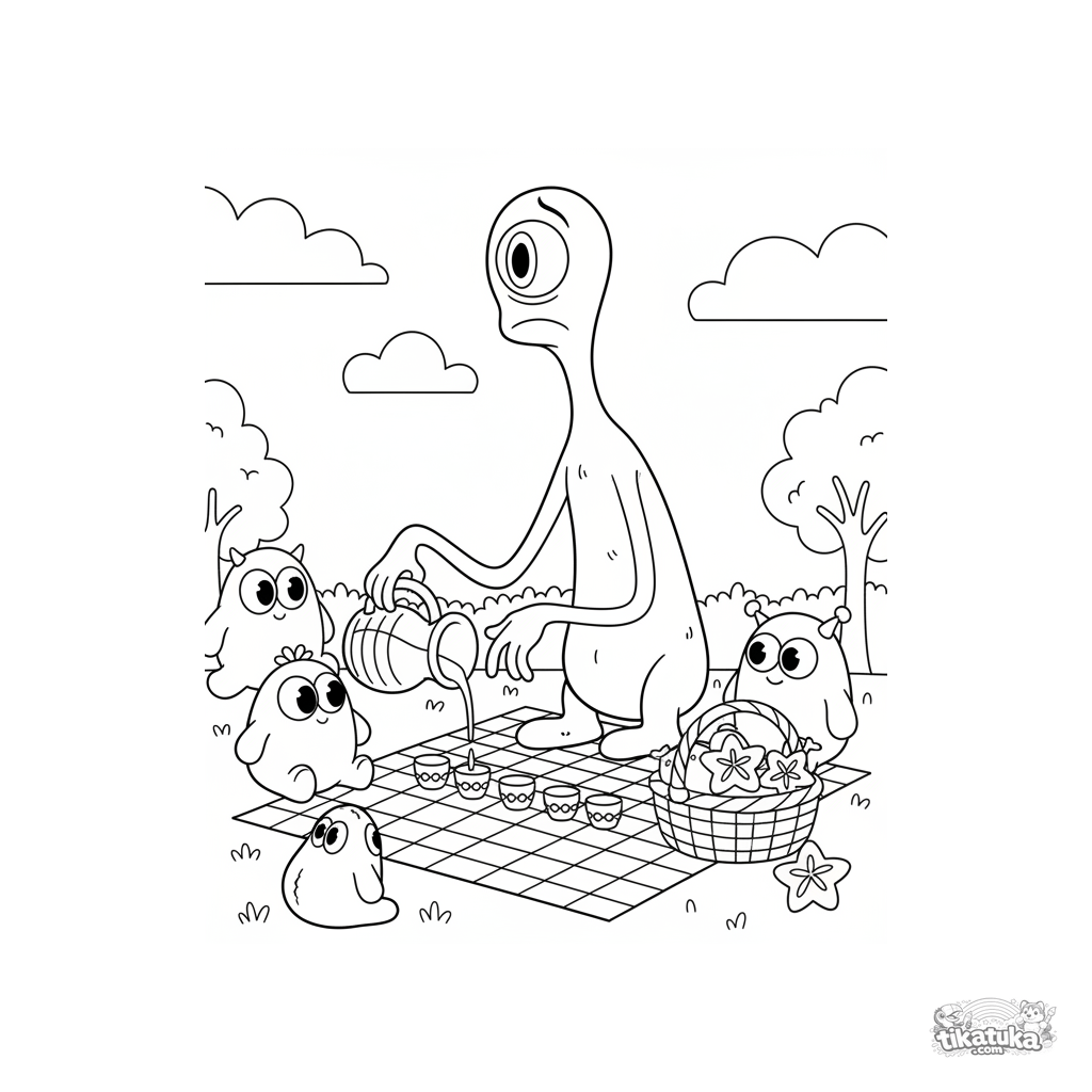 Раскраска с высоким волнистым монстром, который наливает сок на пикнике. Для детей 7-9 лет. Дружелюбная сцена с монстрами и сладостями.