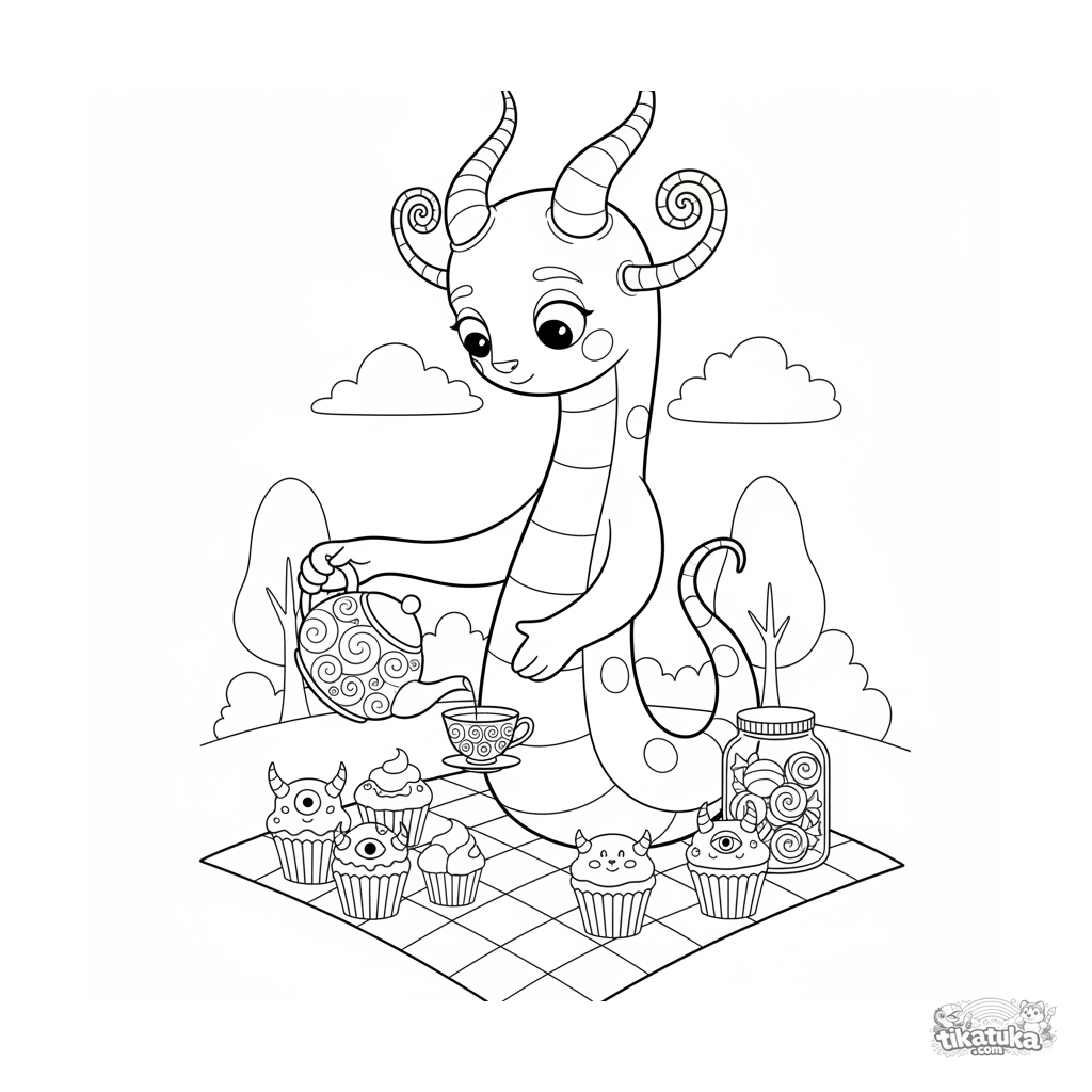 Раскраска с высоким монстром, наливающим чай на пикнике со сладостями. Для детей 7-9 лет. Милая и элегантная сцена для творчества.
