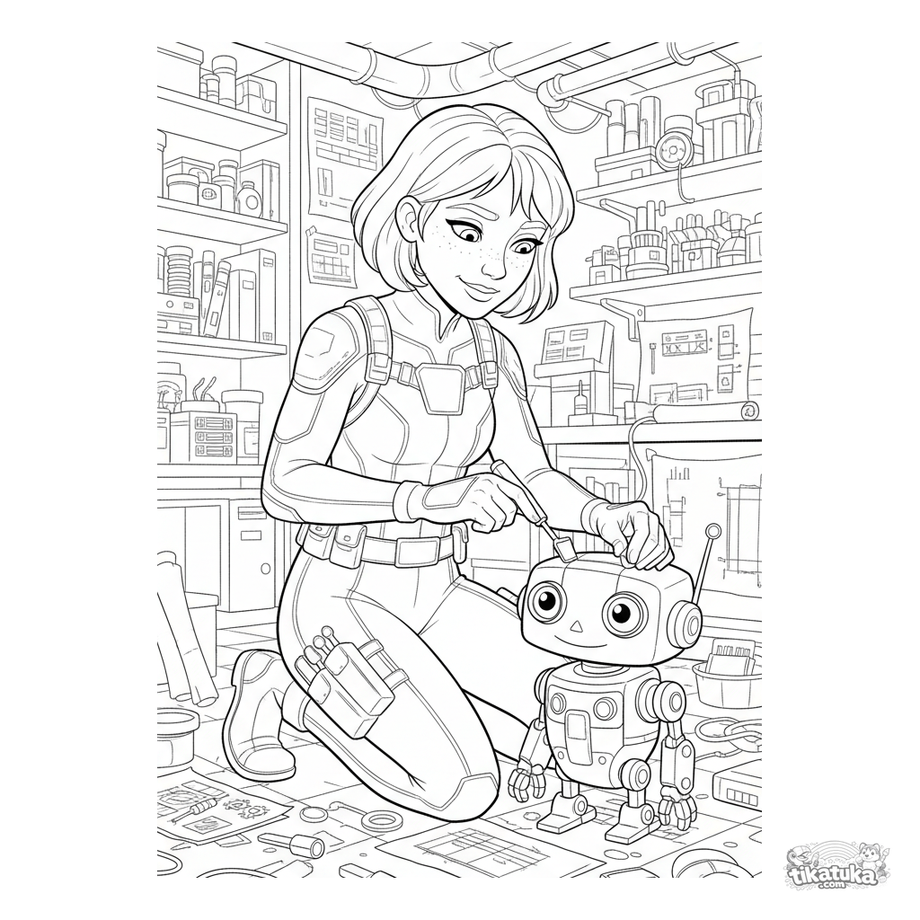 Раскраска для детей 7-9 лет: супергерой-изобретатель в подземной лаборатории чинит своего маленького робота-помощника среди деталей и чертежей.