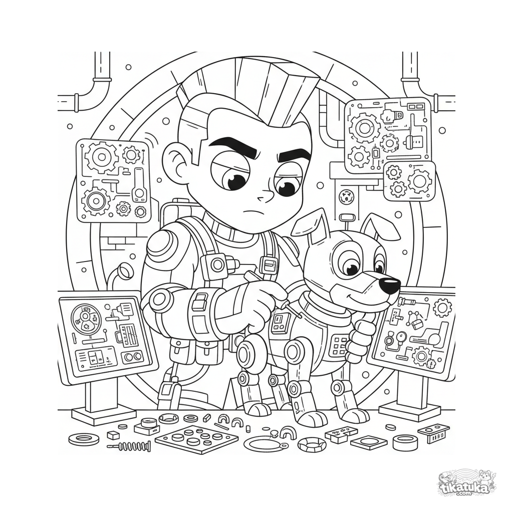 Раскраска для детей 10-12 лет: супергерой-изобретатель с инструментами чинит робота-собаку в подземной лаборатории, окружённый голографическими схемами.