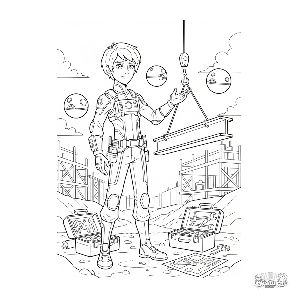 Раскраска для детей 7-9 лет: супергерой-изобретатель в высокотехнологичном костюме управляет дронами, поднимающими балку на строительной площадке.