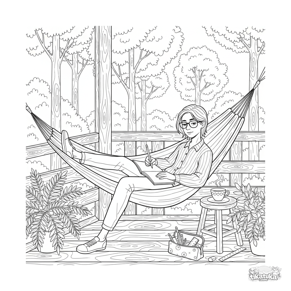 Детальная раскраска для детей 10-12 лет: подросток рисует в блокноте, лежа в гамаке на веранде дачи. Высокий уровень детализации, творческая атмосфера.