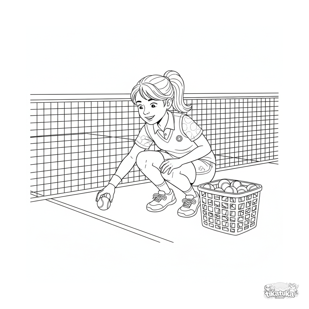 Раскраска для детей 10-12 лет: подающий мячи в форме приседает у сетки на теннисном корте, собирая мячи. Детализированная сцена с корзиной и формой.