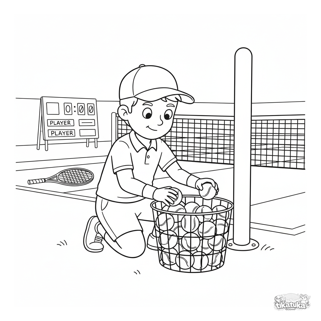 Раскраска для детей 7-9 лет: подающий мячи с корзиной у сетки на теннисном корте. Показана важная роль помощника в спорте.