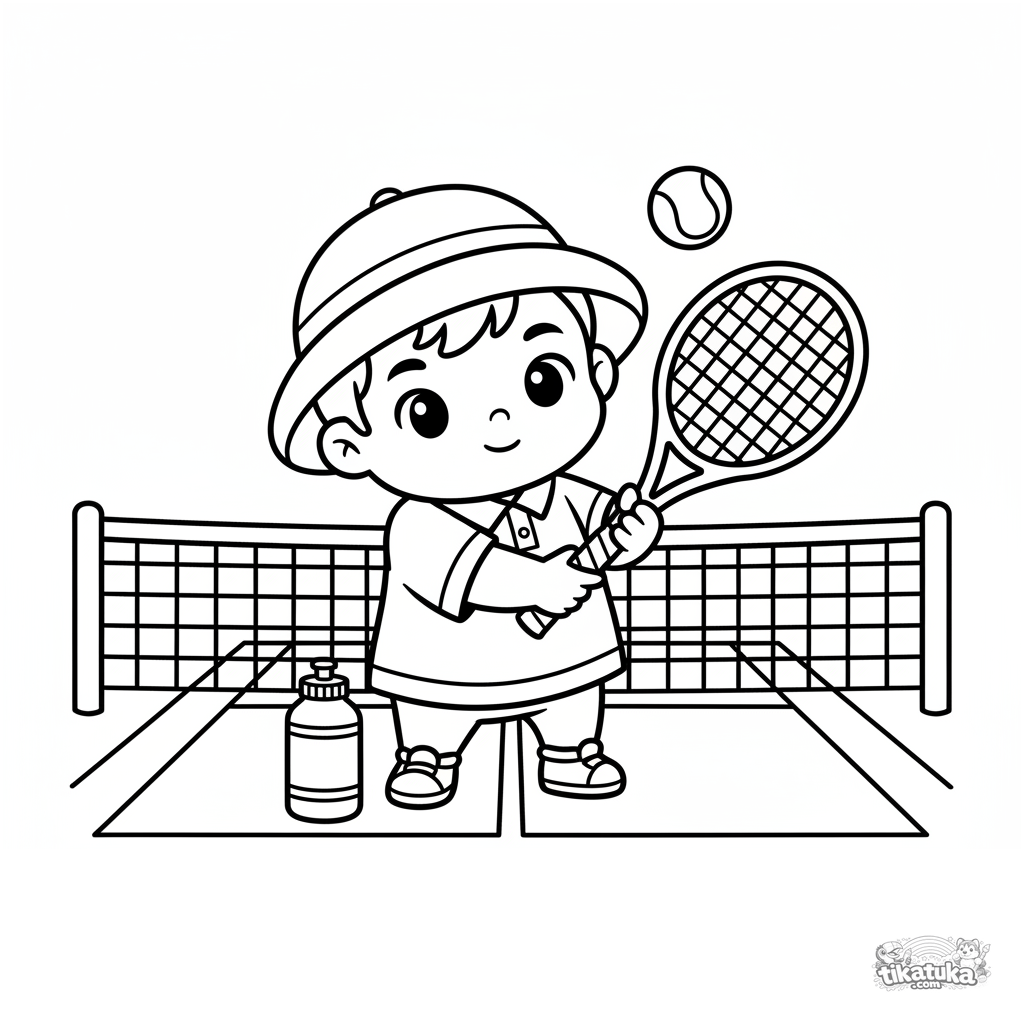 Раскраска для малышей 2-3 лет: весёлый малыш на теннисном корте готовится подать мяч. Простые формы, широкие поля для раскрашивания.