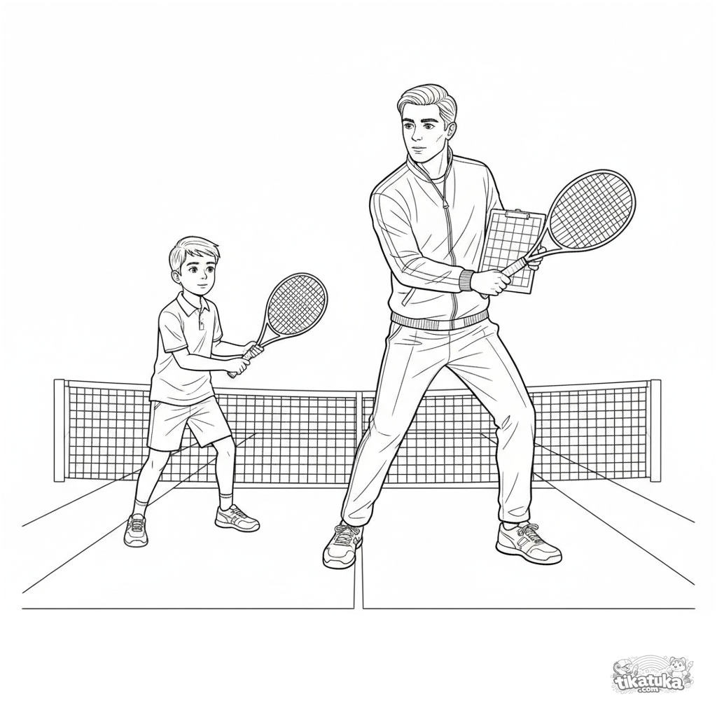 Детальная раскраска для детей 10-12 лет: тренер по теннису демонстрирует технику удара с задней руки ученику на корте. Анатомически точные позы.