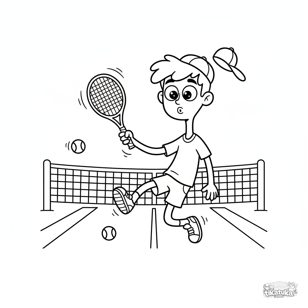 Смешная раскраска для детей 7-9 лет: теннисист поскальзывается на мяче на корте. Динамичная комичная сцена с летящей ракеткой и шляпой.