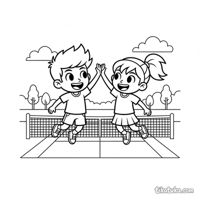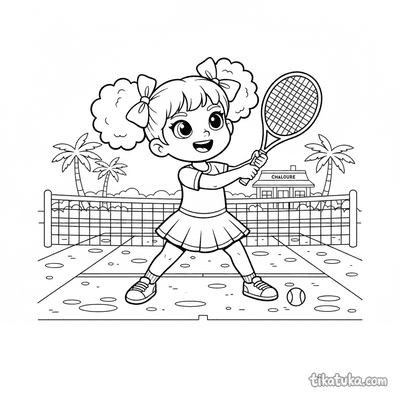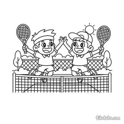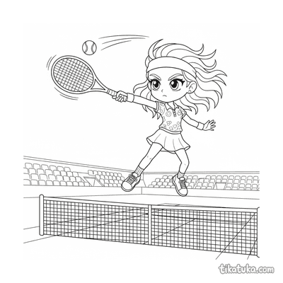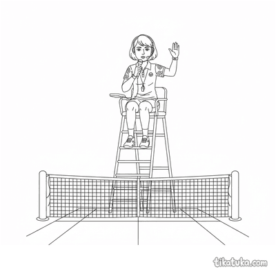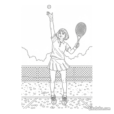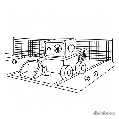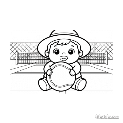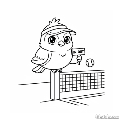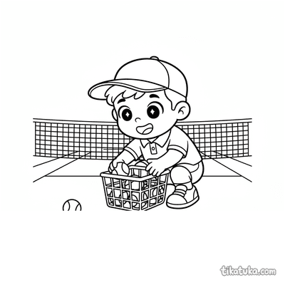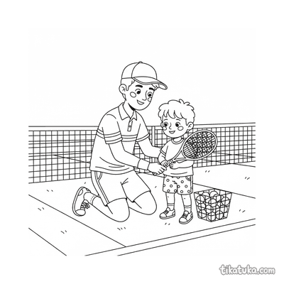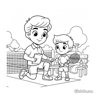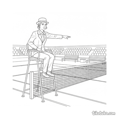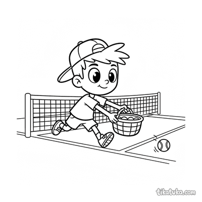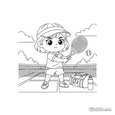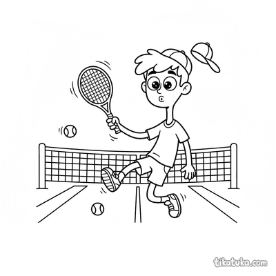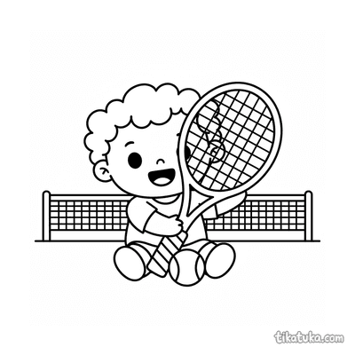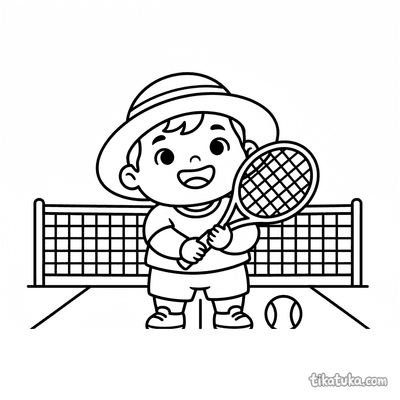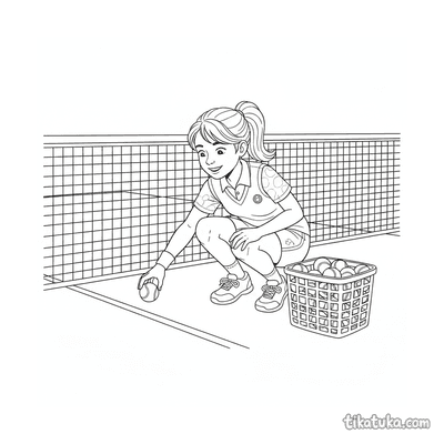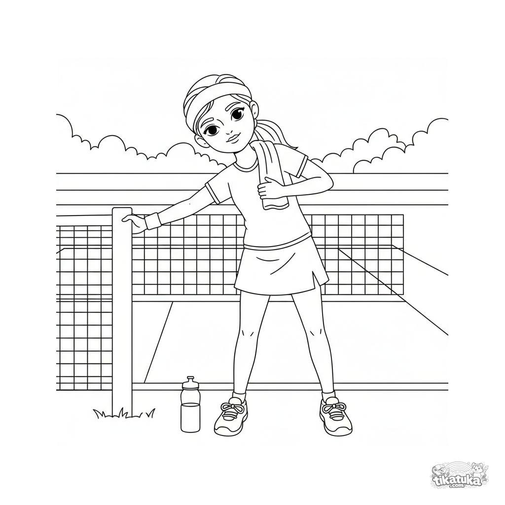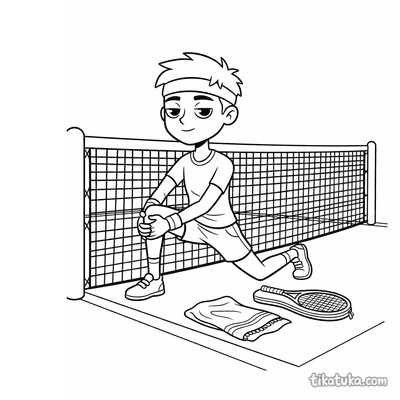 Раскраска для детей 7-9 лет: теннисист делает растяжку у стойки сетки на корте. Спокойная сцена, аккуратные линии в стиле акварельного скетча.