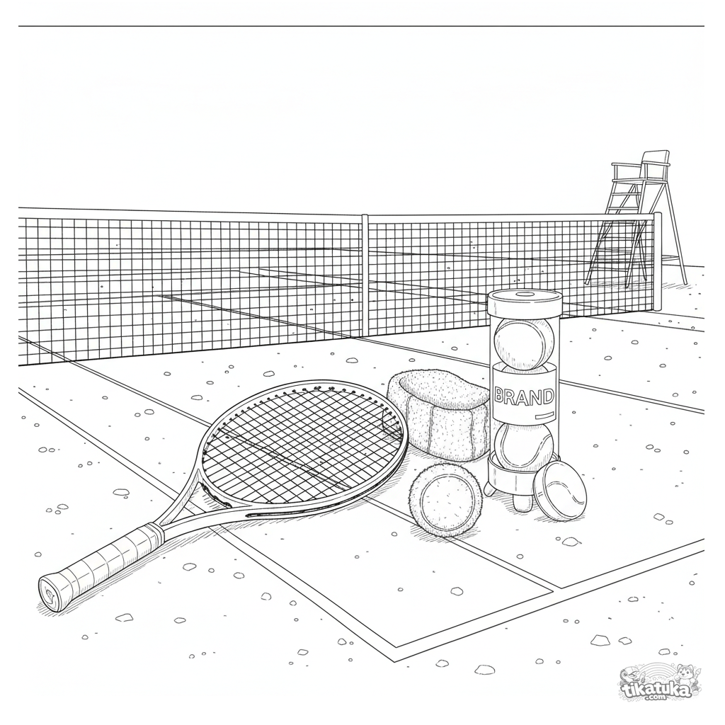 Сложная раскраска для 10-12 лет: детальный натюрморт с теннисной ракеткой и мячом на корте. Технический стиль, чёткие линии, текстуры, для терпеливых художников.