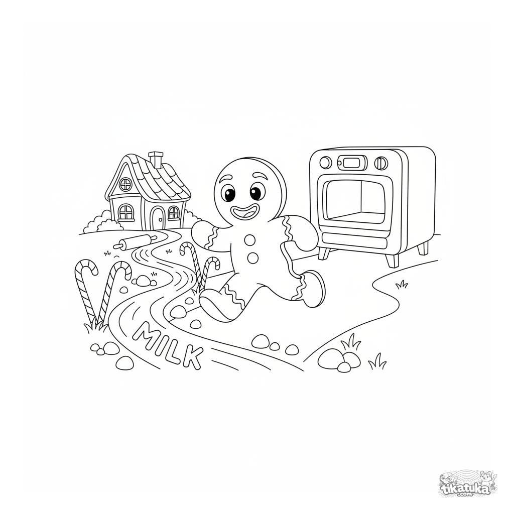 Раскраска по сказке: Пряничный человечек убегает мимо молочной реки в конфетном лесу. Яркая сцена из известной сказки для детей 4-6 лет.