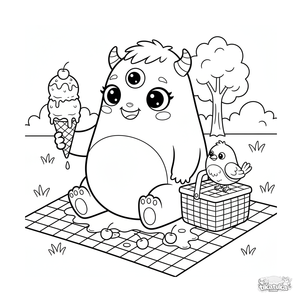 Добрая раскраска для детей: трехглазый монстр делится мороженым с птичкой на пикнике. Сцена о дружбе и щедрости с милыми персонажами.