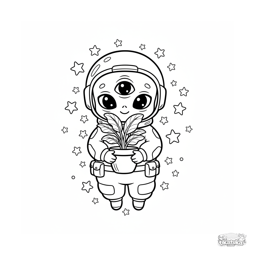 Раскраска для детей 4-6 лет: милый инопланетянин-ботаник парит среди звезд, держа в руках светящееся растение в горшке. Простые четкие контуры.