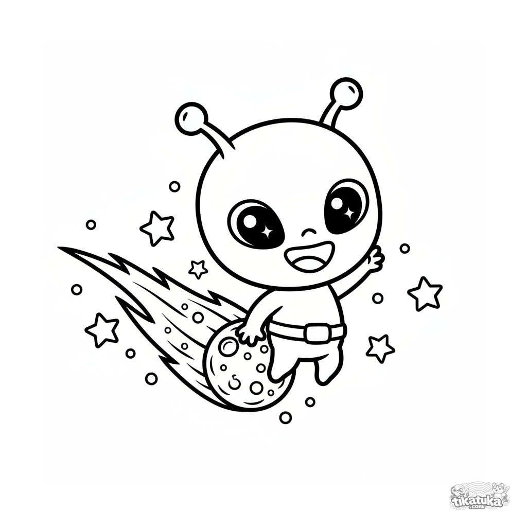 Раскраска для малышей 2-3 лет: милый инопланетянин летит на комете. Крупные простые формы, очень мало деталей, идеально для первых карандашей.