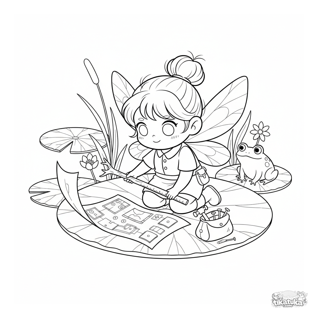 Раскраска для детей 7-9 лет: крошечная фея-архитектор рисует детальные планы на большом листе кувшинки. Милая и детализированная фэнтези-сцена у пруда.