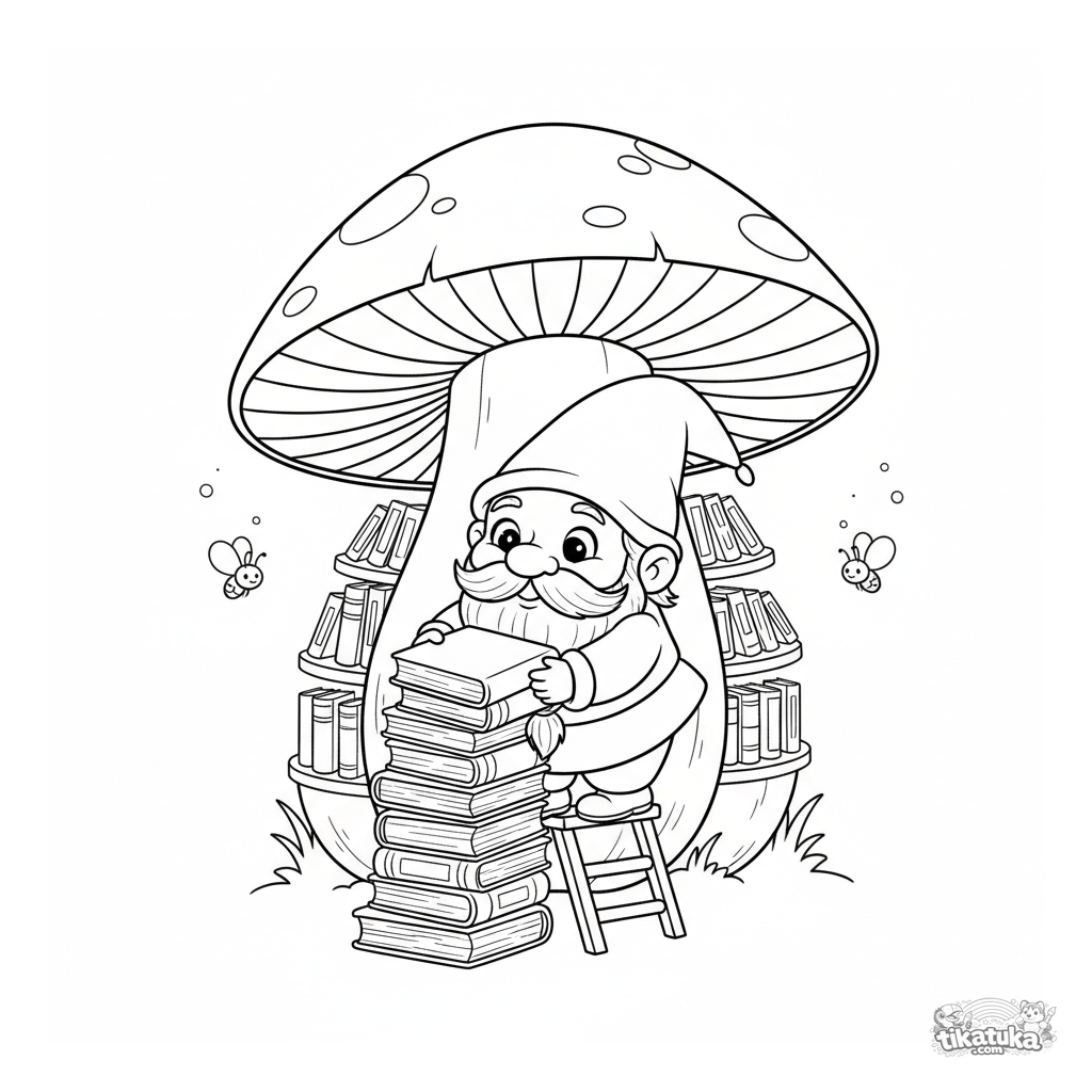 Раскраска для детей 4-6 лет: гном-библиотекарь сортирует светящиеся книги внутри гигантского гриба. Милая волшебная сцена с дружелюбными светлячками.